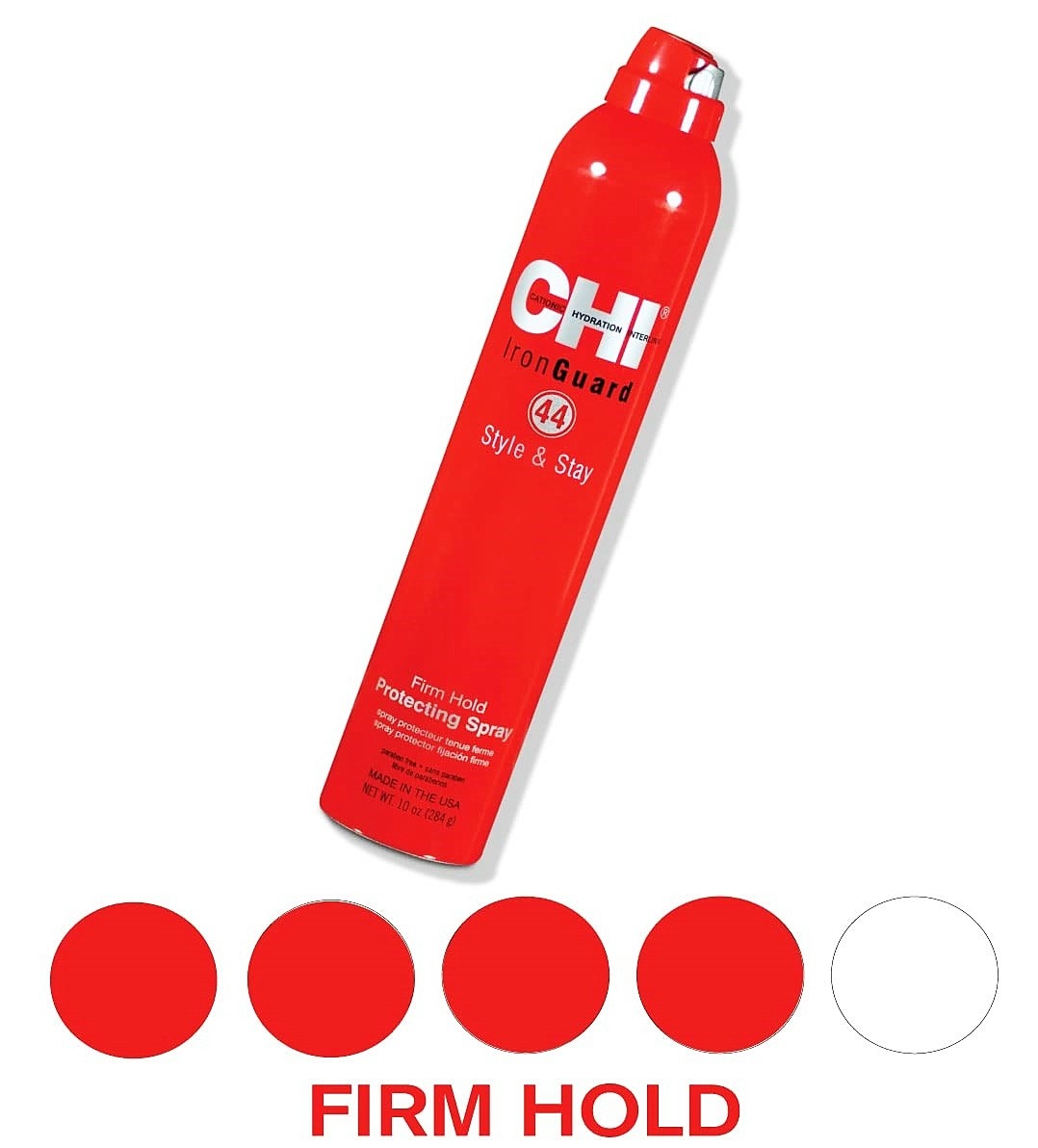 CHI 44 Iron Guard Style & Stay Firm Hold Spray ist in einer 74-Gramm- und einer 284-Gramm-Packung erhältlich.