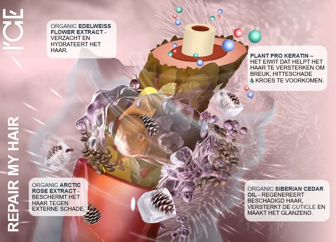 Aqua, Cetearyl Alcohol, Glycerin, Ricinus Communis Seed Oil, Cetrimonium Chloride, Hydrolyzed Vegetable Protein (plant keratin), Hydrolyzed wheat Protein, Pinus Sibirica Seed Oilwh (organic cedar oil), Novosieversia Glacialis Extract wh (organic arctic rose extract), Leontopodium Alpinum Flower/Leaf Extract (organic Edelweiss extract), Sodium PCA, Juniperus Sibirica Needle Extract wh (organic juniper extract), Pinus Sibirica Needle Extract wh (organic pine extract), Rosa Canina Fruit Oil (organic rose hip oil), Betula Alba Leaf Extract (organic Birch extract), Behentrimonium Chloride, Polyquaternium-37, Bis-Cetearyl Amodimethicone, Hydroxyethylcellulose, Phenyl Trimethicone, Tocopheryl Acetate, Guar Hydroxypropyltrimonium Chloride, Lauryl Glucoside, Benzyl Alcohol, Benzoic Acid, Sorbic Acid, Citric Acid, Parfum, Benzyl Salicylate, Coumarin, Hydroxycitronellal, Linalool.