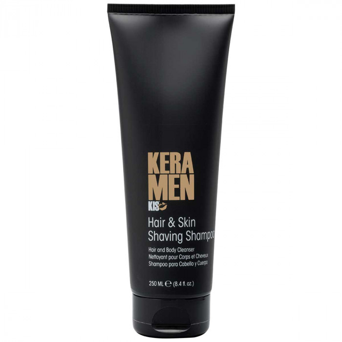 El champú para afeitar KIS KeraMen Hair & Skin es un champú que cuida tanto el cabello como la piel. El champú repara el cabello y limpia suavemente. El champú mejora el equilibrio de humedad y deja el cabello brillante y sedoso, haciendo que el cabello vuelva a lucir más saludable. El champú también es un jabón de afeitar y un gel de baño, lo que significa que el champú ofrece pura comodidad para su uso en la ducha. El champú es adecuado para todo tipo de piel y cabello.