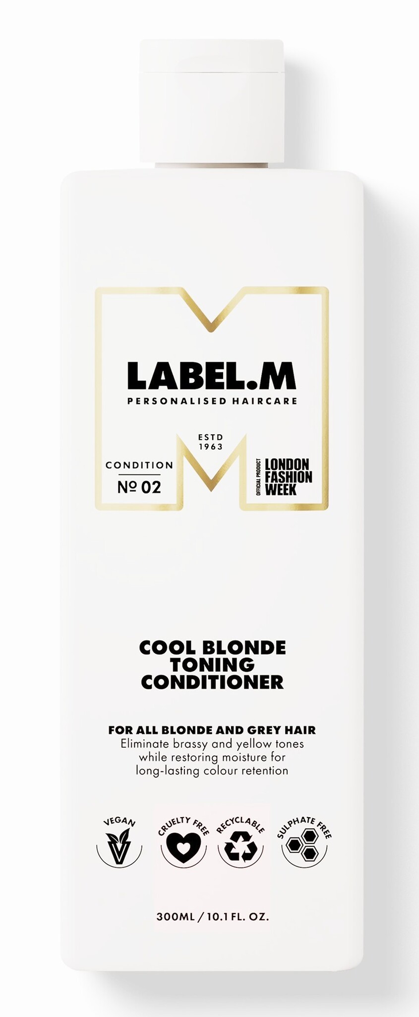L'après-shampoing tonique Label.M Cool Blonde est disponible en emballages de 300 ml et 1000 ml.