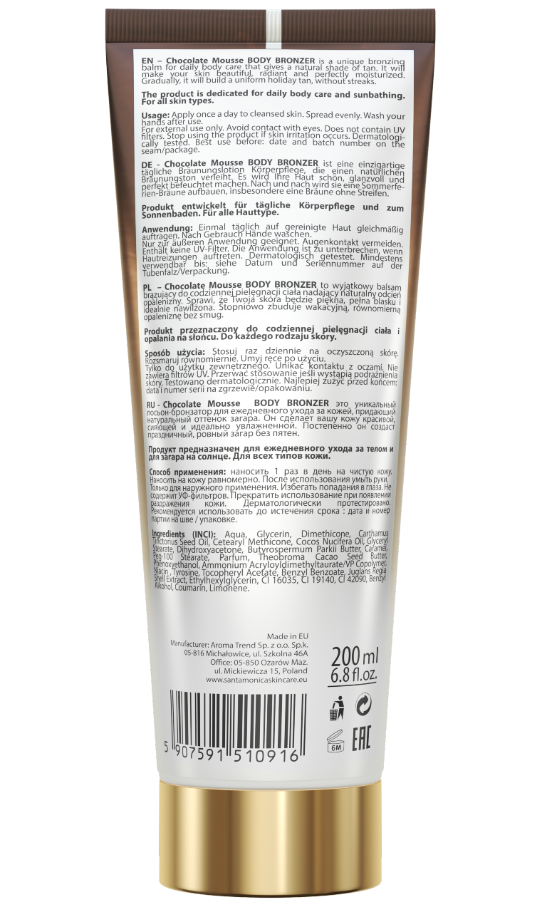 Ingrédients (INCI) : Aqua, Glycérine, Diméthicone, Huile de graines de Carthamus Tinctorius, Cétéaryl Méthicone, Huile de Cocos Nucifera, Stéarate de Glycéryle, Dihydroxyacétone, Beurre de Butyrospermum Parkii, Caramel, Stéarate de Peg-100, Parfum, Beurre de graines de Theobroma Cacao, Phénoxyéthanol, Copolymère d'acryloyldiméthyltaurate d'ammonium/VP, Niacine, Tyrosine, Acétate de tocophéryle, Benzoate de benzyle, Extrait de coquille de Juglans Regia, Éthylhexylglycérine, CI 16035, CI 19140, CI 42090, Alcool benzylique, Coumarine, Limonène.
