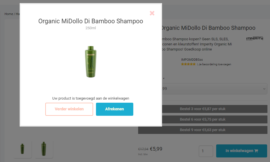 1. Iets bestellen begint natuurlijk met het uitzoeken van de gewenste producten. We gebruiken in dit voorbeeld de Imperity Organic MiDollo Di Bamboo Shampoo. Als je op dit product zoekt, krijg je het volgende te zien: