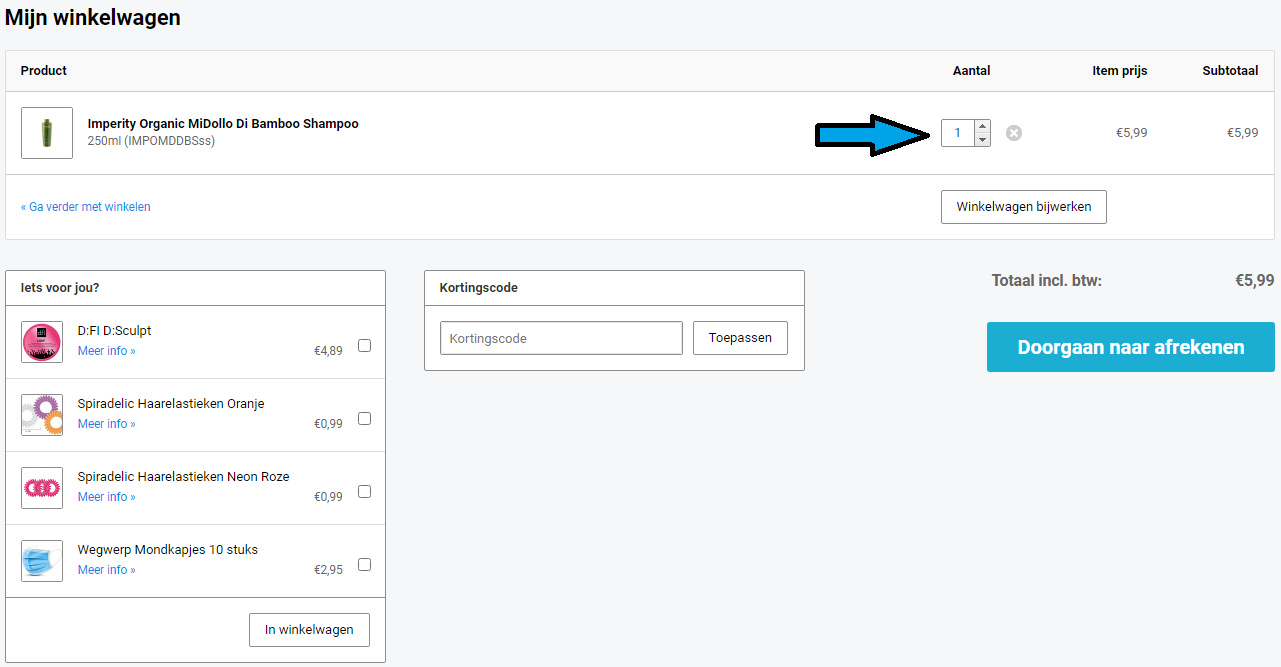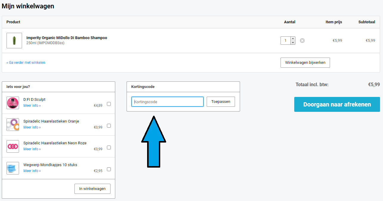6. Soms kun je gebruik maken van een kortingscode. Als je gebruik wilt maken van een kortingscode, kun je deze ook toevoegen in je winkelwagen. Onder de producten in je winkelwagen en naast de voorgestelde producten staat namelijk een venster waarin je de kortingscode kunt typen. Zorg ervoor dat je de kortingscode helemaal goed overneemt, inclusief hoofdletters! Anders werkt de code niet.