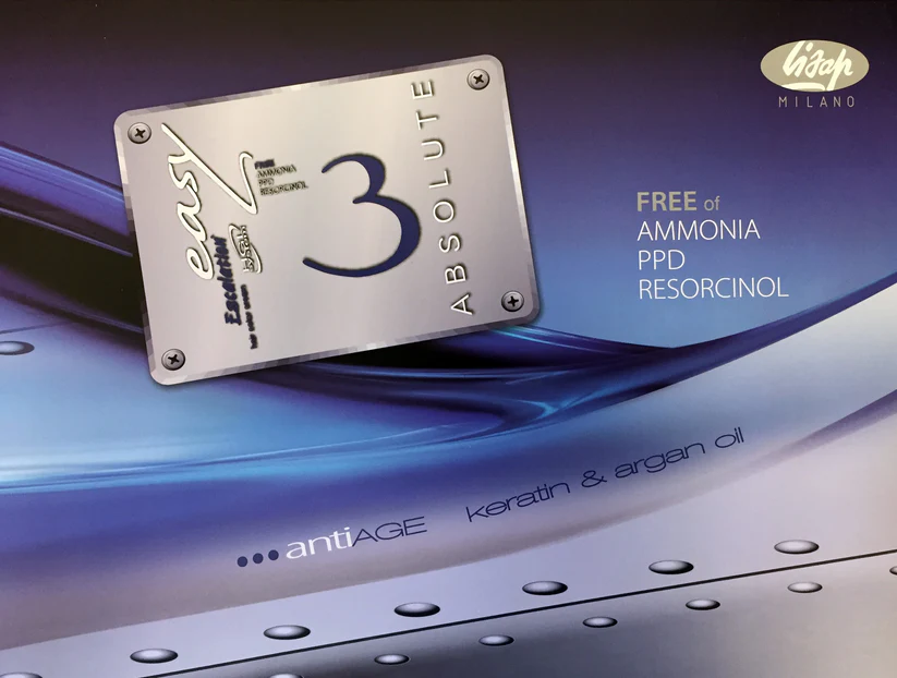 Boekoverzicht met nauwkeurige haarstalen van het volledige permanente kleurbereik zonder ammoniak van Easy Absolute. Haarstalen zijn afneembaar en kunnen dus heel nauwkeurig worden vergeleken met de bestaande haarkleur.